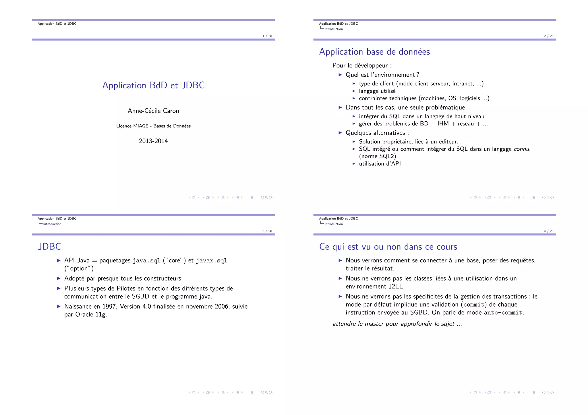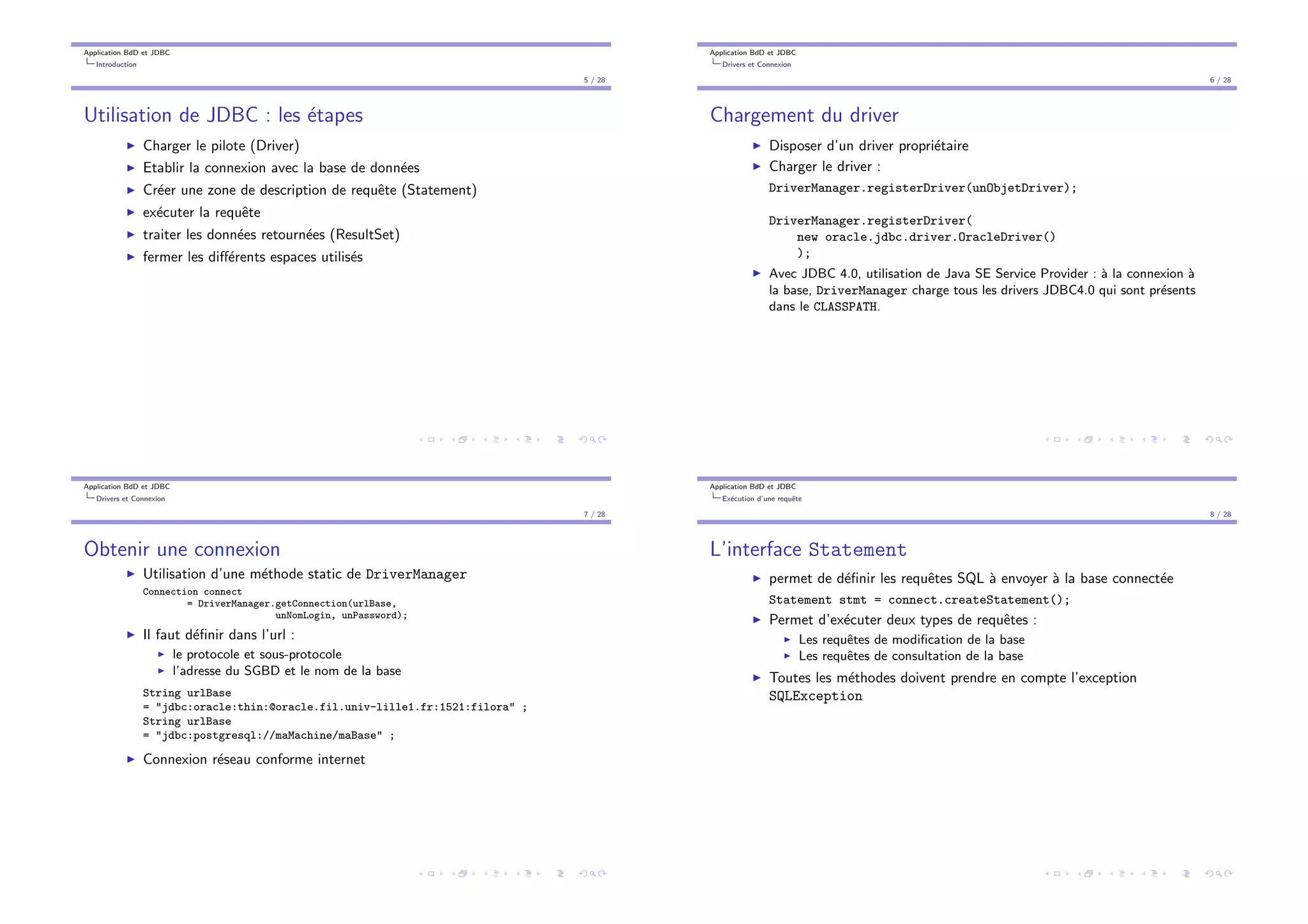 Ce document explique comment utiliser JDBC pour interagir avec des bases de données à partir de Java, couvrant des notions telles que la connexion, l'exécution de requêtes, et la gestion des ressources. Il décrit également comment utiliser des instructions préparées et des procédures stockées, ainsi que les différentes types de ResultSet et leurs opérations. Enfin, il aborde des concepts de méta-données et de gestion des erreurs lors des opérations sur la base de données.