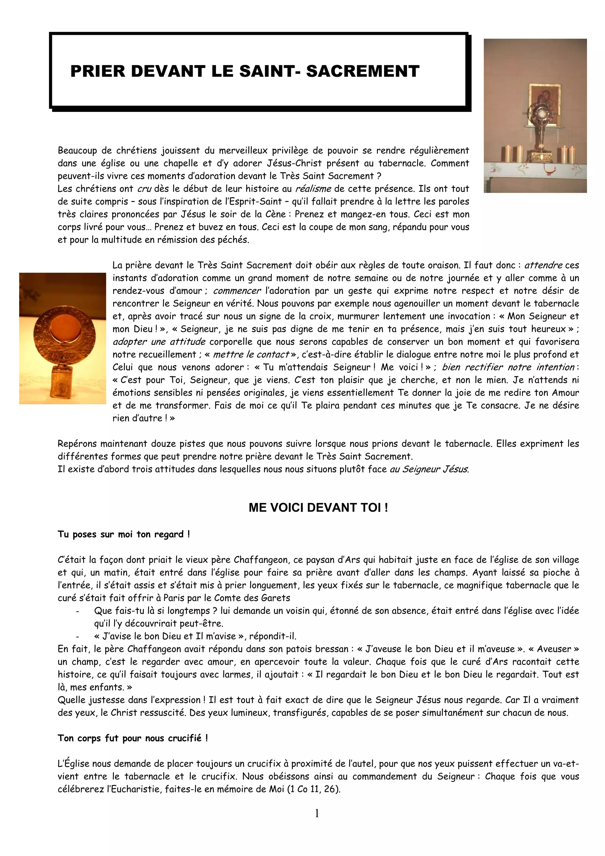 Le document traite de l'adoration du Saint-Sacrement par les chrétiens, soulignant l'importance de vivre ces moments comme des rendez-vous d'amour avec Jésus-Christ présent au tabernacle. Il aborde les attitudes appropriées et les intentions à adopter lors de cette prière, ainsi que des pistes pour approfondir notre relation avec le Christ. En contemplant la passion de Jésus, les fidèles sont encouragés à se laisser transformer, purifier et à prier pour l'Église et le monde.