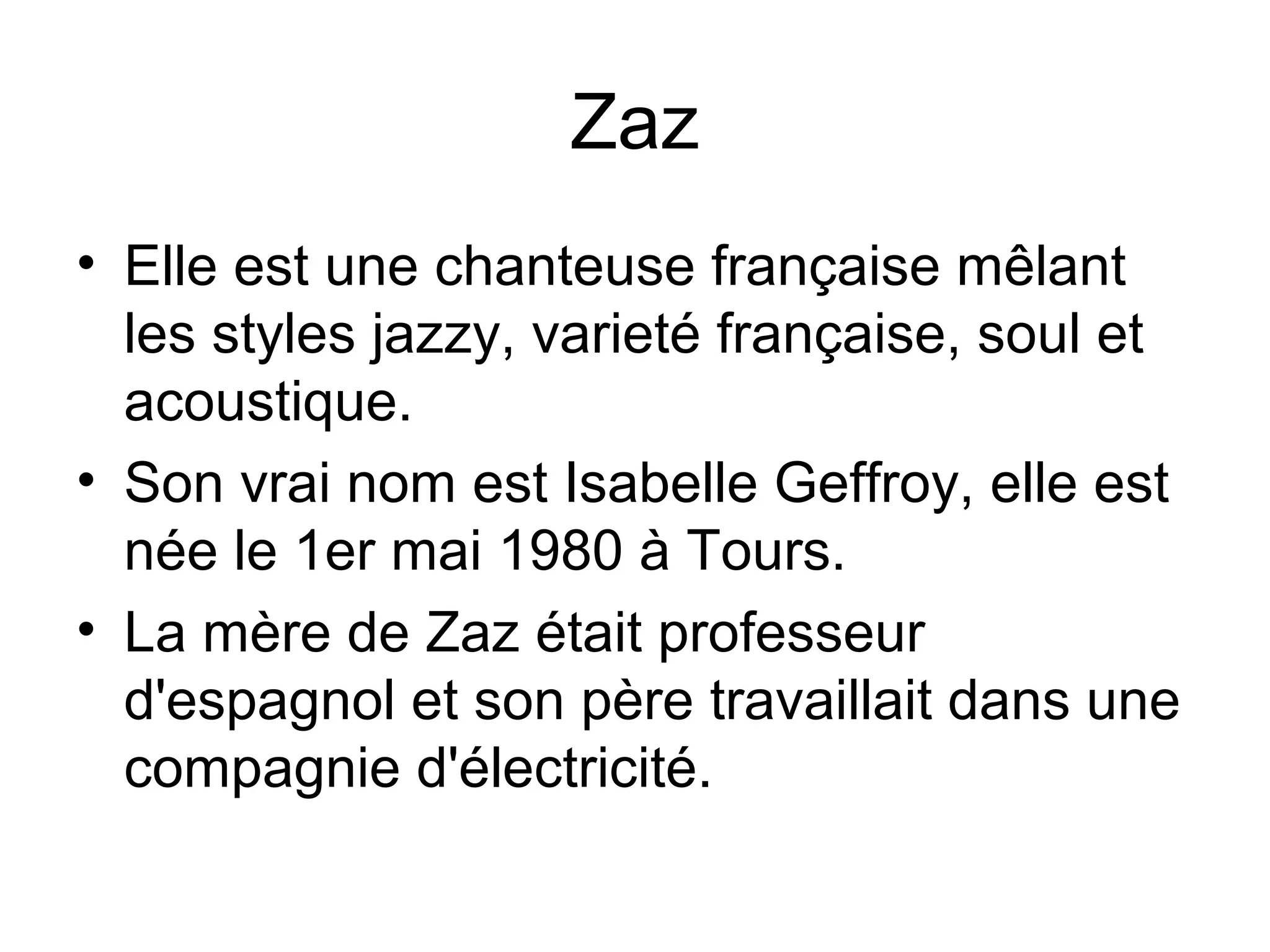 Zaz, de son vrai nom Isabelle Geffroy, est une chanteuse française née le 1er mai 1980, connue pour ses styles jazzy, variété française, soul et acoustique. Ses paroles expriment un désir de liberté et un rejet des conventions sociales, plaçant l'authenticité au cœur de son message. Elle se positionne contre l'hypocrisie et les attentes matérielles, affirmant une identité forte et personnelle.