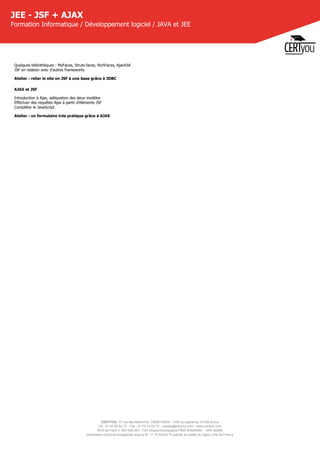 La formation certyou sur JSF et AJAX vise à enseigner l'utilisation de JSF pour le développement d'applications et inclut des ateliers pratiques. Sur une durée de 3 jours, les participants apprendront à construire des projets, à manipuler des éléments front-end, et à intégrer des bases de données. En outre, un coaching post-formation de 30 jours est proposé pour assurer le soutien des participants.