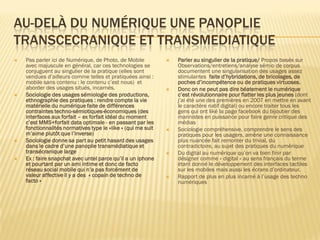 Laurence Allard examine l'impact des technologies numériques sur l'identité des jeunes, soulignant que l'usage des réseaux sociaux, bien loin d'être uniforme, est façonné par des pratiques individuelles et des dynamiques sociales. Le document met en avant des statistiques sur l'usage des écrans et des réseaux sociaux, ainsi que la façon dont les adolescents utilisent ces outils pour construire et exprimer leur identité à travers le partage de contenus. Enfin, il aborde la notion d'individualisme expressif, mettant en lumière la complexité des interactions entre vie privée et vie publique dans le contexte numérique.