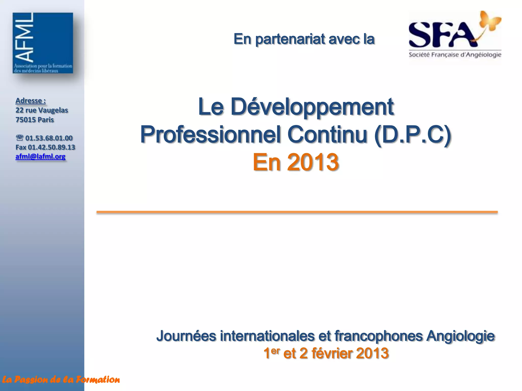 Le document traite du développement professionnel continu (DPC) pour les professionnels de santé, remplaçant la formation professionnelle conventionnelle. Il présente les modalités de fonctionnement et les thématiques des formations proposées en 2012 et 2013, ainsi que les indemnisations associées aux programmes de DPC. Des thèmes variés sont abordés, comme l'artériopathie oblitérante et la thrombose, avec un accent sur l'amélioration des pratiques professionnelles.