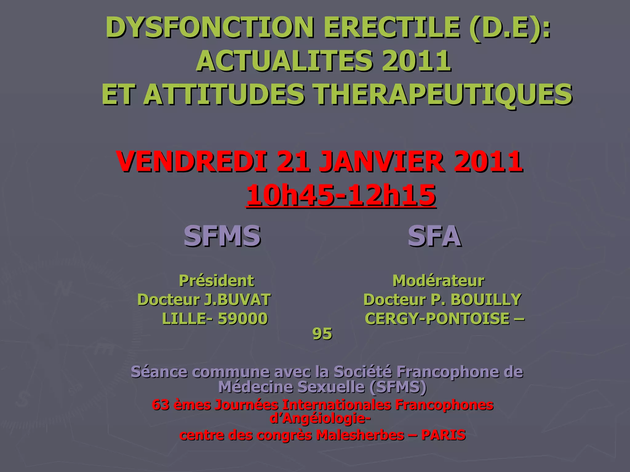 La réunion de janvier 2011 aborde la dysfonction érectile (d.e.), son impact sur le mode de vie et l'utilisation des IPDE5, tout en soulignant l'importance du pharmaco-echodoppler pénien (PEDP) dans le diagnostic. Les intervenants discutent également des implants péniennes comme solution thérapeutique et de la responsabilité médicamenteuse dans l'apparition de la d.e. Le document se concentre sur des stratégies de traitement, des recommandations actuelles et une revue des thérapies impliquées.