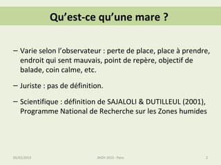 Le document traite des mares en Île-de-France, définies comme des étendues d'eau à renouvellement limité, avec un maximum de 5000 m² et une profondeur de 2 m, offrant une biodiversité riche et des services écologiques. Il aborde également les différentes origines et types de mares, leurs intérêts pour la biodiversité, et les menaces qu'elles subissent, notamment la pollution et l'artificialisation. Enfin, il souligne l'importance de projets existants visant à protéger ces milieux naturels.
