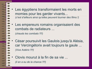 Ce document présente une collection humoristique de bêtises écrites par des élèves lors d'examens, accompagnées de commentaires amusants des enseignants. Les erreurs portent sur des sujets variés allant de l'histoire à la biologie, illustrant souvent un manque de compréhension et de sérieux. Le ton léger et comique encourage le lecteur à rire des méprises tout en réfléchissant à l'éducation.