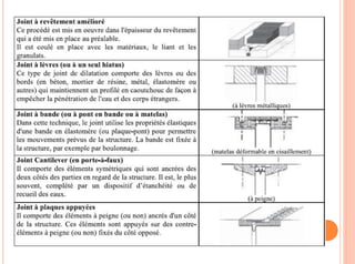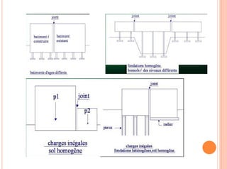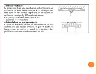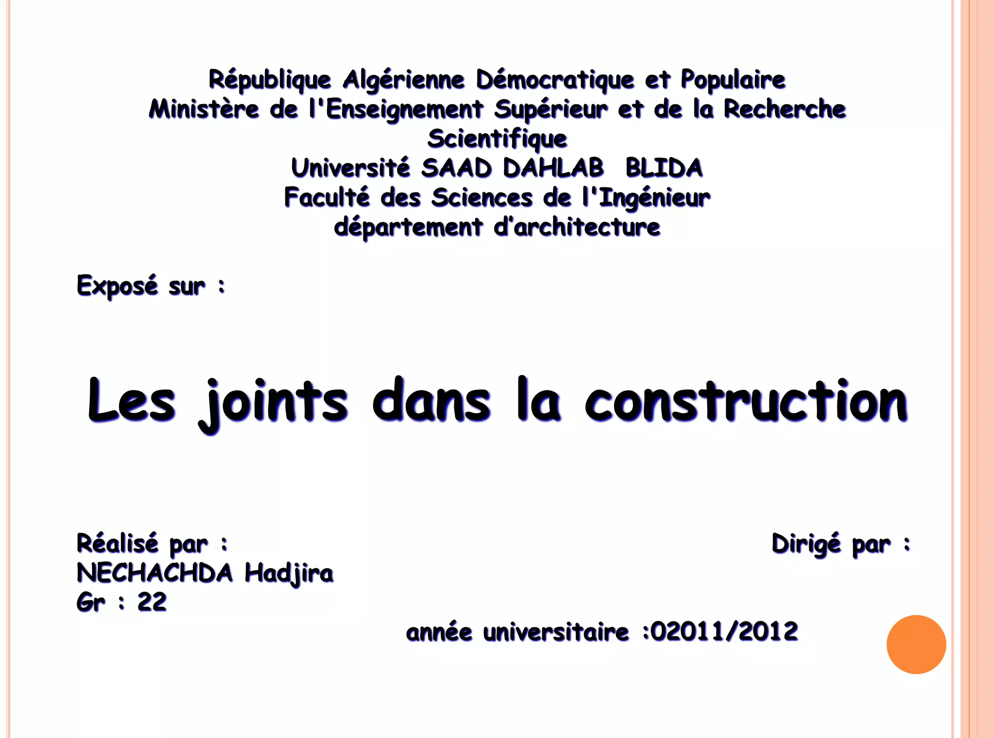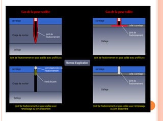 Le document présente un exposé sur les joints dans la construction, définissant leur fonction essentielle en tant que dispositifs permettant des mouvements et des déformations dans les structures tout en évitant les fissures. Il détaille les différents types de joints, leurs applications spécifiques, ainsi que les matériaux utilisés pour leur réalisation. Enfin, il souligne l'importance cruciale des joints pour la durabilité et la sécurité des ouvrages.