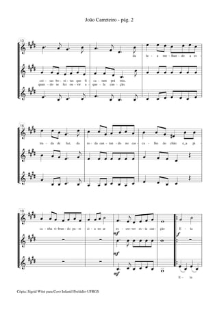 Le document est une transcription de la chanson 'João Carreteiro' de Gil Villeroy, avec des indications musicales de Murilo Vescovi et des arrangements d'Irineu Krüger. Il contient des paroles qui évoquent la nostalgie et des thèmes de la vie rurale. Le texte semble également comprendre des notations musicales et des instructions pour une représentation chorale.