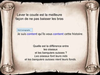 Ce document est une compilation humoristique de jeux de mots, blagues et petites histoires qui exploitent les homographes et les différences entre divers objets ou êtres. Il utilise un langage ludique et une structure de questions-réponses pour amuser le lecteur. Les thèmes abordés incluent des observations drôles sur la vie quotidienne, les relations humaines et des traits d'animaux.
