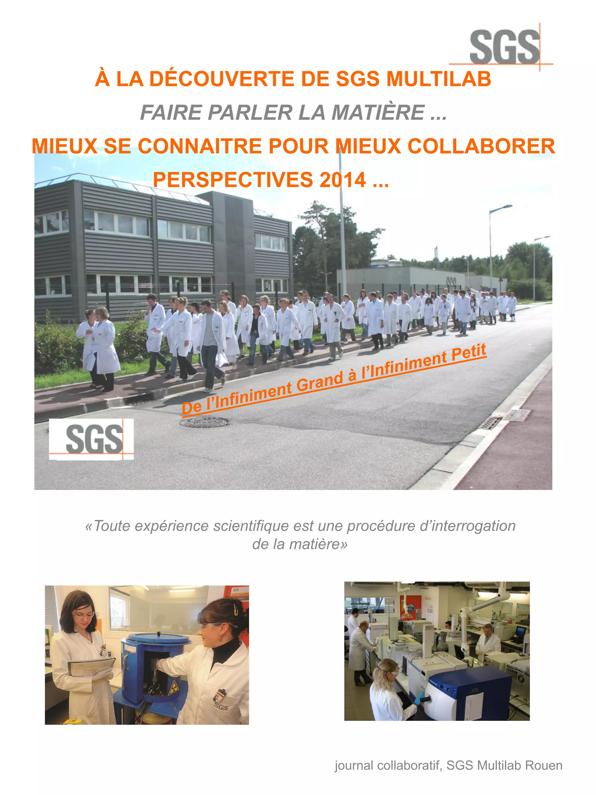 SGS Multilab est un laboratoire pluridisciplinaire basé à Rouen, spécialisé dans l'analyse et la recherche de la matière pour divers secteurs tels que l'agriculture et l'environnement. Il utilise des technologies avancées pour expertiser la qualité et la conformité des produits, en mettant l'accent sur la compréhension des caractéristiques et des interactions de la matière. Ce document présente également les ateliers et techniques innovantes offerts par le laboratoire pour enrichir les connaissances et collaborations dans le domaine scientifique.