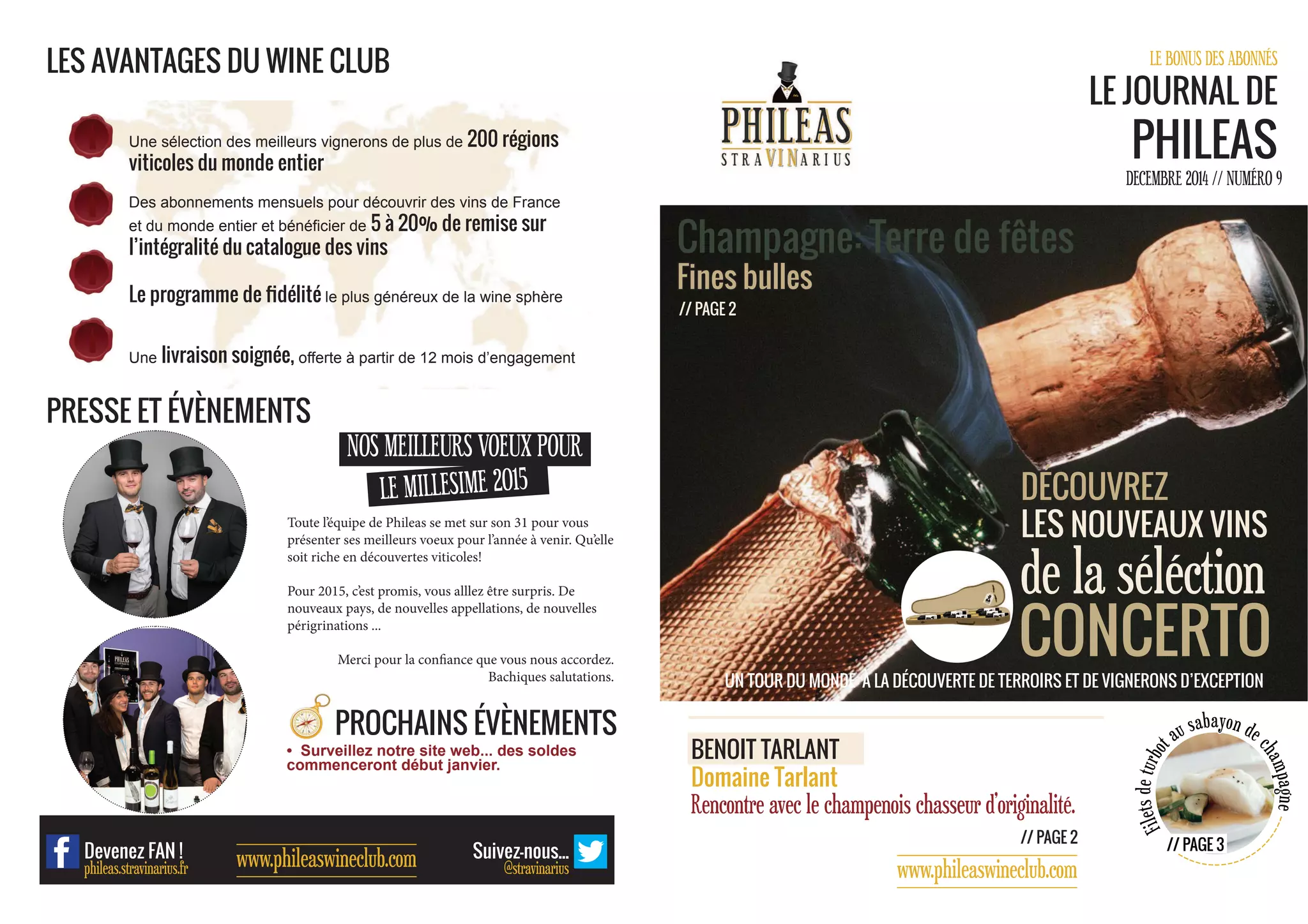 Le document présente le Phileas Wine Club, offrant des abonnements mensuels pour découvrir des vins de diverses régions viticoles et des remises sur leur catalogue. Il met en avant la région viticole de Champagne, les cépages cultivés, et propose une recette de filets de turbot au sabayon de champagne. Le club met également l'accent sur l'importance des rencontres entre vignerons et passionnés, partageant des découvertes vinicoles uniques.