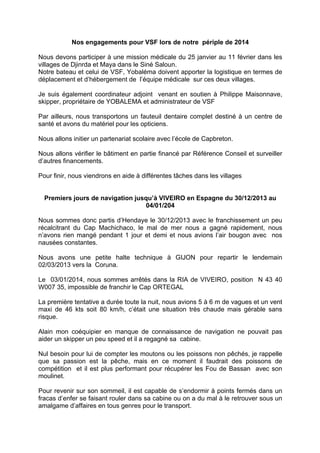 Le document retrace un périple maritime de l'équipe apportant une mission médicale aux villages de Djinrda et Maya en janvier et février 2014. Les marins ont affronté des conditions difficiles, notamment des tempêtes et des pannes, tout en naviguant vers les Canaries avant de rejoindre Dakar. En parallèle, ils ont préparé l'acheminement de matériel médical et initié des partenariats locaux.