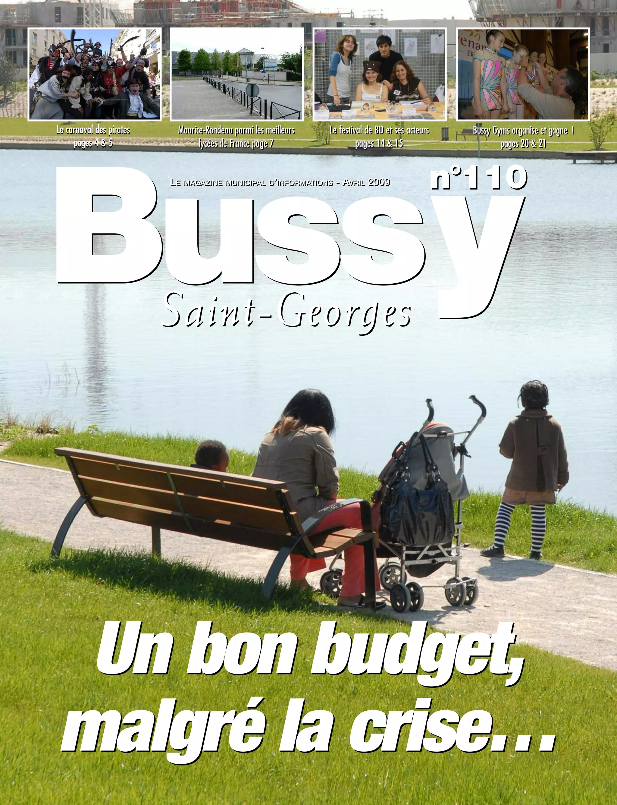 Le numéro d'avril 2009 du magazine municipal de Bussy saint-georges met en avant divers événements locaux tels que le carnaval des pirates et des initiatives culturelles et éducatives. Le maire, Hugues Rondeau, exprime ses inquiétudes concernant la réforme de la taxe professionnelle et ses implications pour la commune face à la crise actuelle. Le magazine présente également des activités de loisirs, des conférences sur la maladie d'Alzheimer, ainsi que les succès de l'établissement scolaire Maurice-Rondeau.