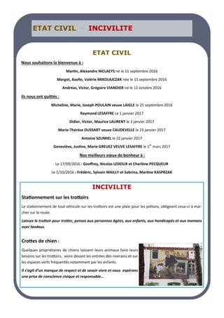 Le document présente divers événements et informations concernant la vie de la commune, notamment des naissances, décès, et des annonces de civilités. Il aborde aussi des problèmes d'incivilité, des travaux de reconstruction comme le pont de Ranchicourt, et des activités lancées par différentes associations locales. Enfin, le maire invite les habitants à participer à des événements communautaires tout en exprimant des préoccupations sur le financement des infrastructures communales.