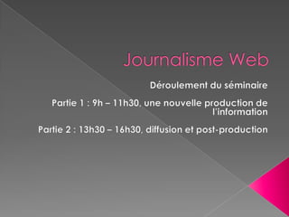 Le séminaire aborde l'évolution du journalisme web, soulignant son caractère innovant et sa nécessité de s'adapter à une nouvelle temporalité de l'information. Il explore les différents outils et techniques permettant de produire, diffuser et interagir avec l'information en ligne, tout en intégrant les réseaux sociaux dans le processus. Enfin, il discute des défis et des opportunités offertes par cette transformation, notamment en matière de curation et de gestion de communauté.