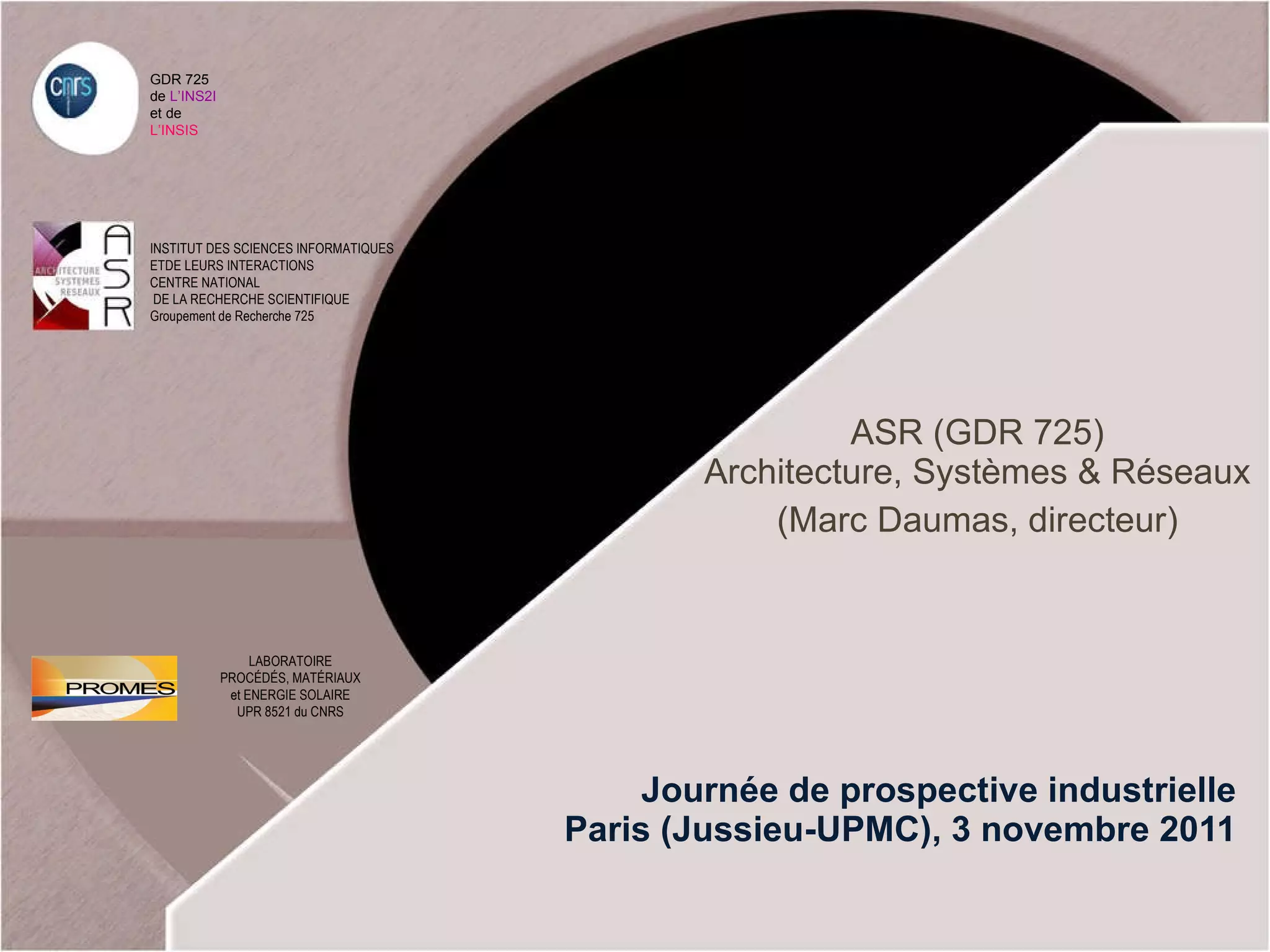 La journée de prospective industrielle à Paris, organisée par le GDR 725, a rassemblé plus de 600 chercheurs pour discuter des efforts de collaboration entre le milieu académique et l'industrie, ainsi que des défis liés à la recherche et développement. Les objectifs incluent l'animation scientifique et la mise en place de partenariats, avec un focus sur des dispositifs de financement tels que l'ANR et le CIR. Le document présente également une analyse SWOT de l'ASR, proposant une vision sur l'avenir de la recherche en France.