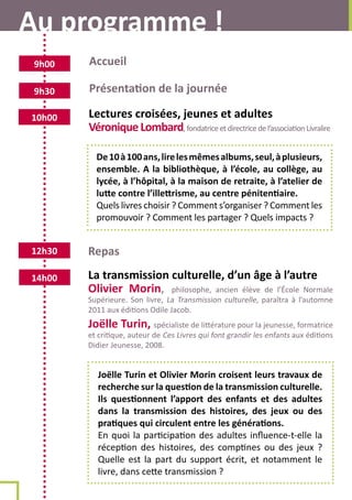 La rencontre, organisée par la médiathèque départementale du Pas-de-Calais, se déroule le 9 mai 2011 à Arras et aborde la transmission culturelle entre générations. Des experts tels que Véronique Lombard, Olivier Morin et Joëlle Turin discutent des livres et des pratiques de lecture partagés entre jeunes et adultes. L'événement propose également des repas locaux à un prix modique et invite les participants à s'inscrire avant le 4 mai.