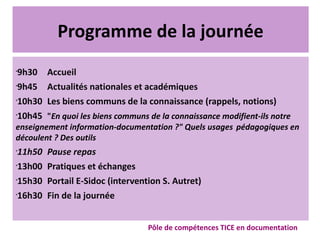 La journée d'information des correspondants TICE en documentation en mars 2014 a couvert divers thèmes, tels que les actualités nationales en éducation et l'impact des biens communs de la connaissance sur l'enseignement. Le document évoque également la mise en œuvre du numérique dans l'éducation, les espaces numériques de travail (ENT), et les outils disponibles pour soutenir l'apprentissage. Enfin, il traite des évolutions récentes des pratiques pédagogiques et de l'importance de la formation continue des enseignants dans ce cadre.