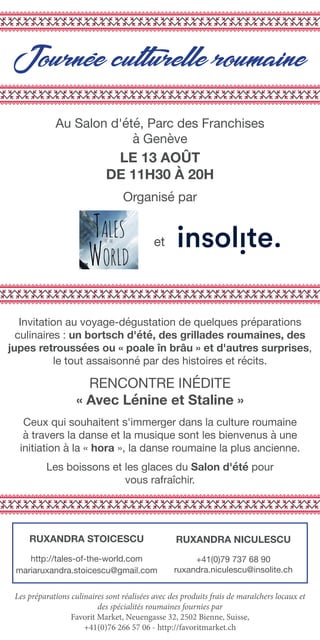 La journée culturelle roumaine se tiendra le 13 août au parc des franchises à Genève, offrant une expérience culinaire avec des plats traditionnels comme le bortsch d'été et des grillades. Des initiations à la danse roumaine « hora » seront proposées, accompagnées d'histoires enrichissantes et de rafraîchissements. Les ingrédients utilisés proviennent de producteurs locaux et de spécialités roumaines fournies par un marché local.