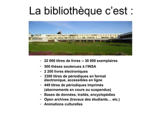 La bibliothèque de l'INSA de Rennes offre un large éventail de ressources, comprenant 22 000 titres de livres, 30 000 exemplaires, ainsi que 2 200 livres électroniques et 3 300 titres de périodiques accessibles en ligne. Elle soutient également la recherche avec 500 thèses et propose des animations culturelles, telles que des concours littéraires. Deux écoles doctorales sont affiliées à la bibliothèque, favorisant la formation de plus de 140 doctorants.