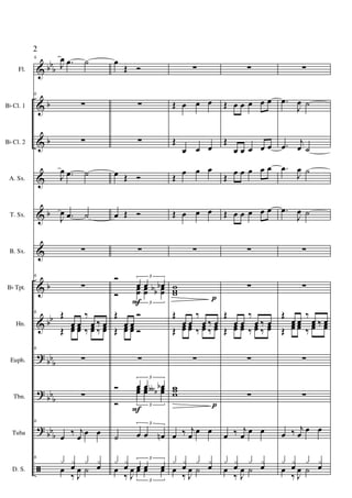 Le document semble être une partition musicale contenant des instructions pour divers instruments tels que la flûte, le clarinette, et le saxophone, avec de nombreux symboles de notation musicale. Les sections semblent indiquer différentes mesures et dynamiques, suggérant une composition complexe. Le contenu est principalement constitué d'annotations musicales et de transcriptions de notes.