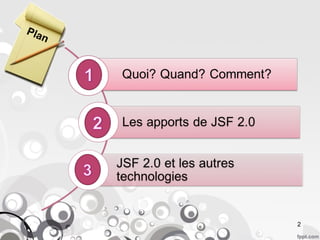 Le document traite de JSF 2.0, un framework Java pour le développement d'applications web basé sur des composants. Il aborde les améliorations de la version 2.0 par rapport aux précédentes, y compris l'intégration d'AJAX et les annotations pour la gestion des beans. Enfin, il mentionne les outils et bibliothèques compatibles pour le développement, comme Richfaces et Icefaces.