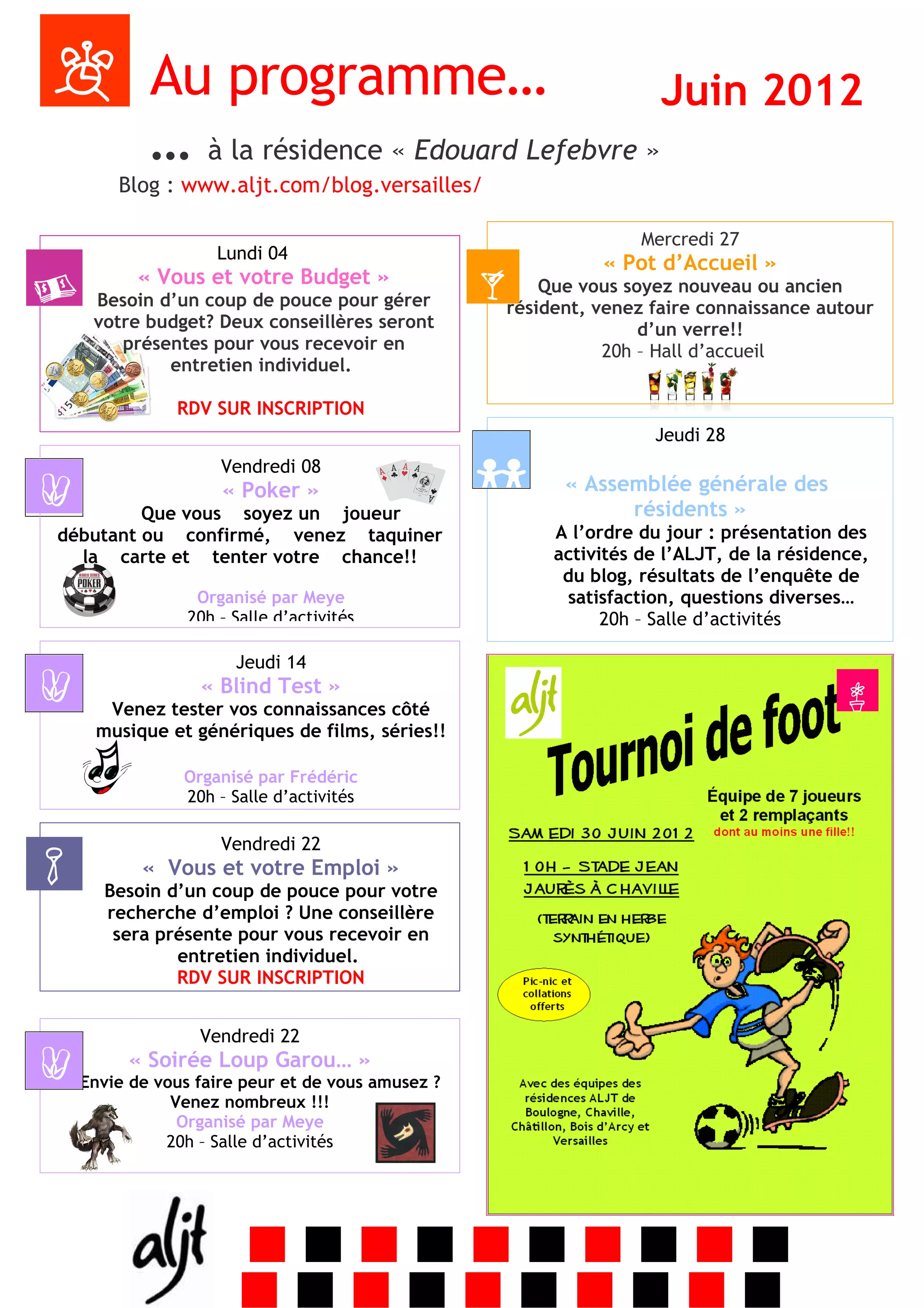 Le programme de juin 2012 à la résidence 'Edouard Lefebvre' propose divers événements, incluant un pot d'accueil pour discuter de budget et des jeux comme le poker et le blind test. Des conseillers seront disponibles pour aider les résidents dans leurs recherches d'emploi lors d'entretiens individuels. Un mélange d'activités sociales et ludiques est prévu pour favoriser les rencontres et le divertissement.