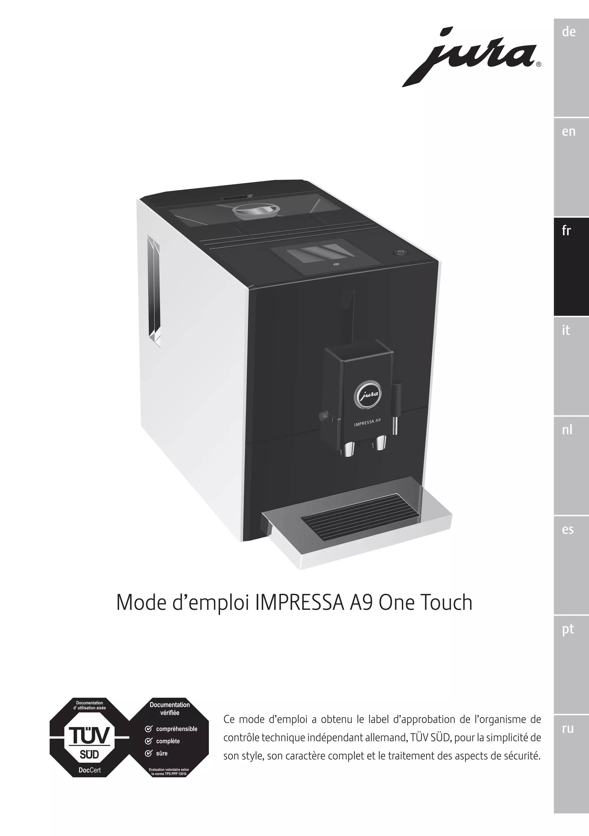 Le mode d'emploi de l'impressa A9 One Touch, approuvé par TÜV Süd, présente des instructions détaillées pour l'utilisation, la préparation, et l'entretien de la machine à café. Il souligne l'importance de la sécurité et fournit des recommandations pour une première mise en service, y compris l'utilisation d'une cartouche filtrante. Le document contient également des sections sur le dépannage, l'entretien régulier et les caractéristiques techniques de l'appareil.