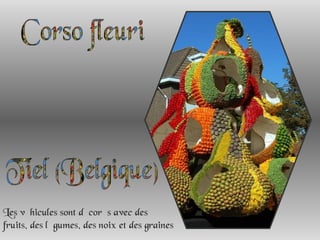 Le corso fleuri à Tiel, en Belgique, présente des véhicules ornés de fruits, légumes, noix et graines. Cet événement met en avant la créativité horticole. Une présentation PowerPoint intitulée 'Finishing Touch' par Senyanzobe accompagne cet événement.