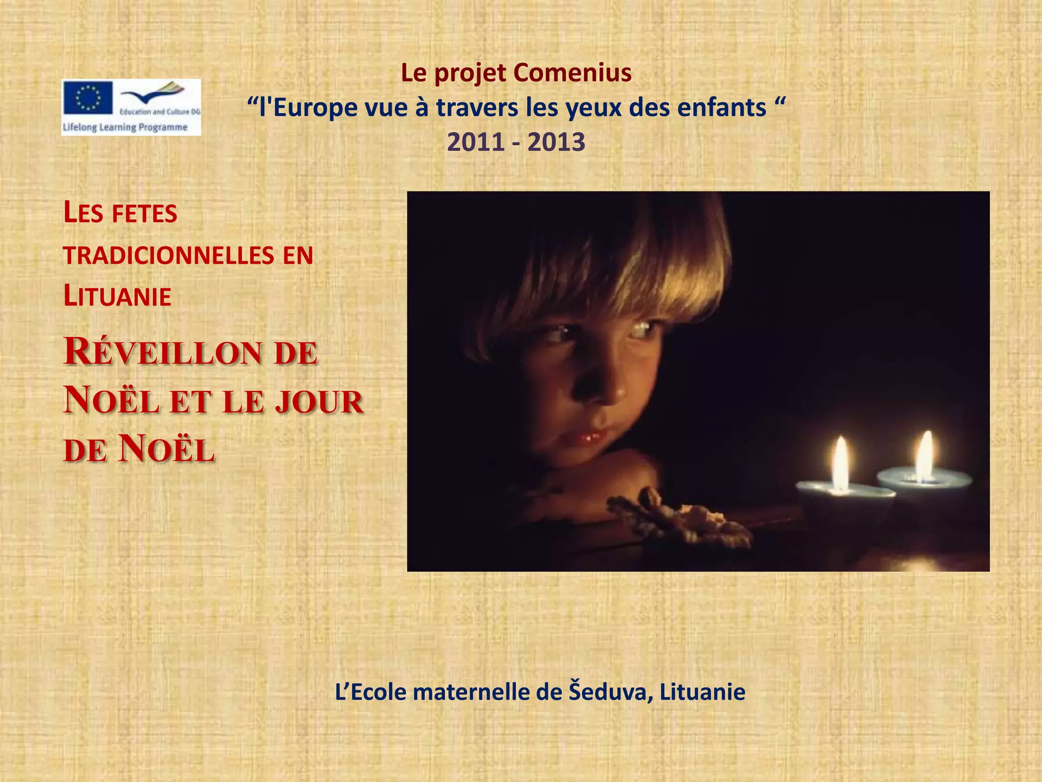 Le projet Comenius présente les traditions de Noël en Lituanie, notamment le réveillon de Noël, appelé Kūčios, qui se distingue par un repas spécial sans viande, symbolisant la paix et l'harmonie familiale. Les rituels incluent le partage d'une ostie de Noël et la mise en place d'une place pour les défunts. Le jour de Noël, les célébrations s'intensifient avec un festin plus festif et l'échange de cadeaux, accompagnés de traditions telles que la visite du Père Noël, Kalėdų Senelis.
