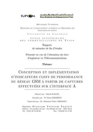 Ce document présente un projet de fin d'études sur la conception et l'implémentation d'indicateurs clés de performance pour le réseau GSM, réalisé au sein de l'entreprise Tunisiana. Il propose une approche de suivi des performances du réseau à partir de captures effectuées sur l'interface A, ainsi qu'un outil pour l'implémentation de ces indicateurs. Des validations et études de cas réels complètent le projet.