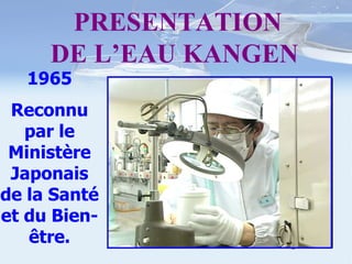 Le document présente l'eau Kangen, une eau alcaline reconnue au Japon, utilisée dans 250 hôpitaux pour ses propriétés antioxydantes et alcalinisantes. Il met en avant les bénéfices de l'eau hexagonale pour la santé, soulignant que beaucoup de gens sont chroniquement déshydratés et que l'alcalinisation favorise le bien-être. Le texte fait également référence à des expertises médicales et promeut les technologies innovantes liées à l'eau Kangen comme solution de santé alternative.