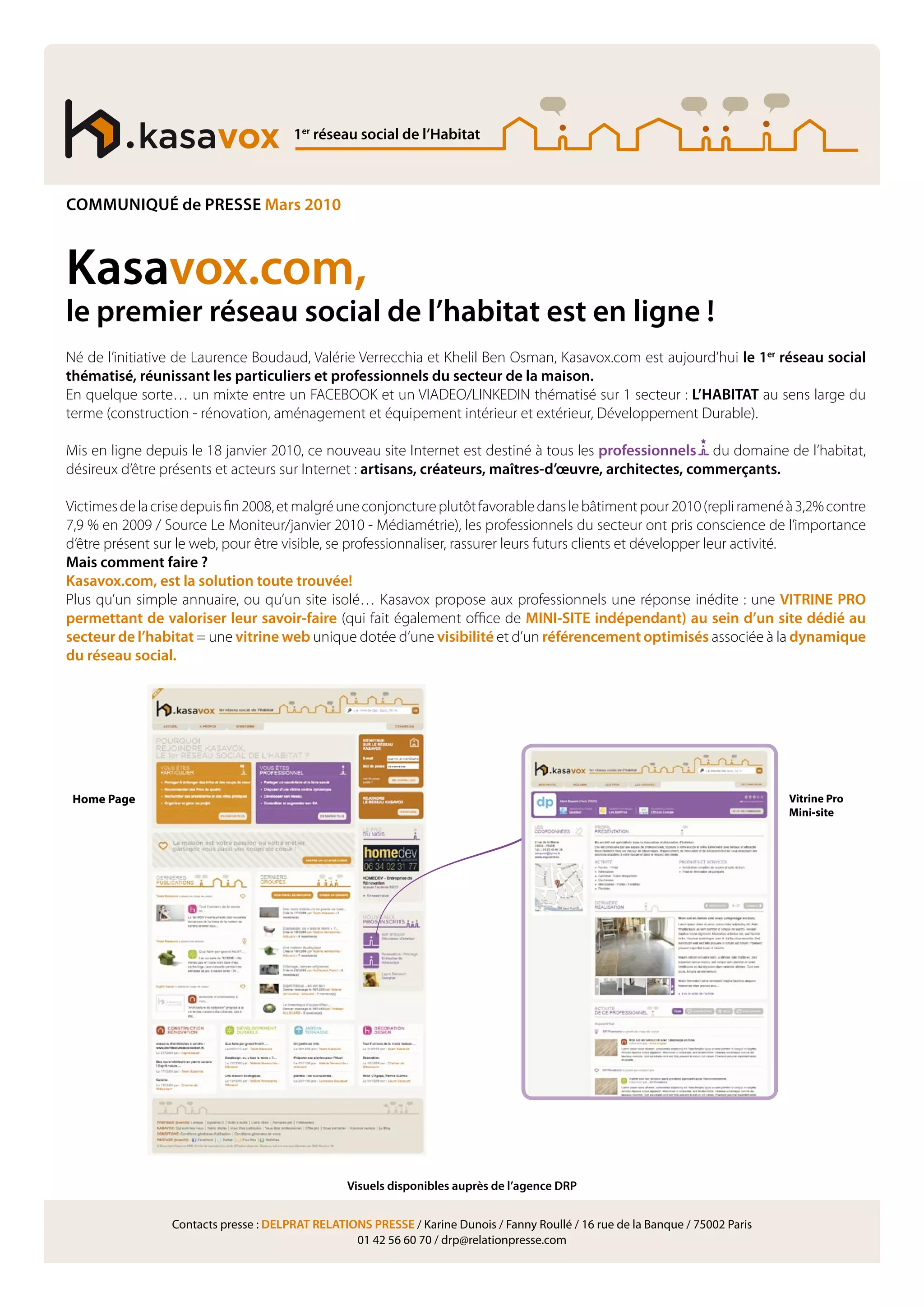 Kasavox.com est le premier réseau social thématisé dédié au secteur de l'habitat, lancé en janvier 2010, visant à connecter particuliers et professionnels liés à la maison. Ce site permet aux professionnels de valoriser leur expertise à travers une vitrine en ligne dynamique et d'échanger des conseils avec leurs clients et partenaires. En offrant des outils personnalisables et des services adaptés, Kasavox.com soutient les acteurs du secteur dans le développement de leur visibilité et de leur activité sur internet.