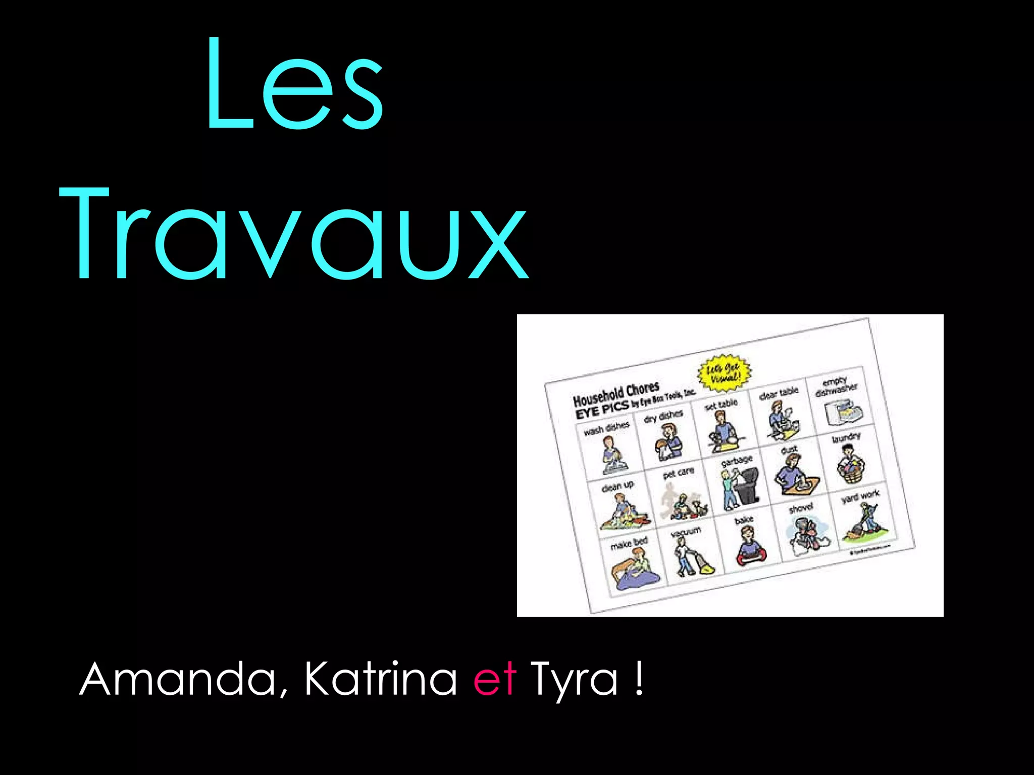 Le document énumère les tâches ménagères à réaliser par Amanda, Katrina et Tyra. Les tâches incluent faire le lit, laver la vaisselle, balayer le sol, tondre le gazon et sortir les ordures. Il se termine par une mention de l'achèvement de ces tâches.