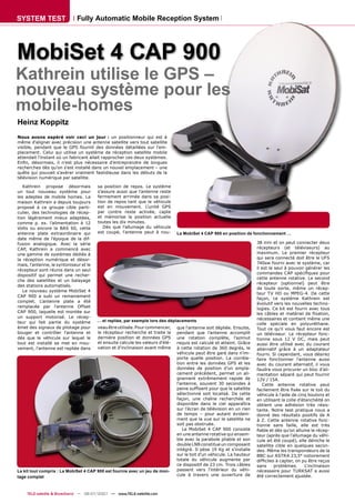 Le système Mobiset 4 Cap 900 de Kathrein est une antenne satellite rotative conçue pour les mobile-homes, intégrant un GPS pour un alignement rapide et précis sur les satellites visibles. Il assure que l'antenne reste fixée en position lors des déplacements et se déploie automatiquement à l'arrêt, facilitant ainsi l'accès à la télévision numérique. Ce système est complet, léger et peut capter des signaux difficiles, tout en étant conçu pour s'adapter à de nouvelles technologies.