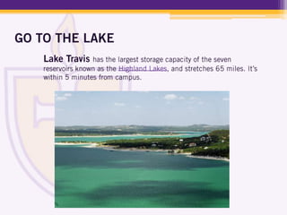 Le document présente diverses attractions et activités à Austin, Texas, mettant en avant son identité unique. Il mentionne des entreprises prospères, des films tournés sur place, et des célébrités résidant dans la ville. Il propose également des recommandations sur la cuisine locale et des activités sociales à ne pas manquer.