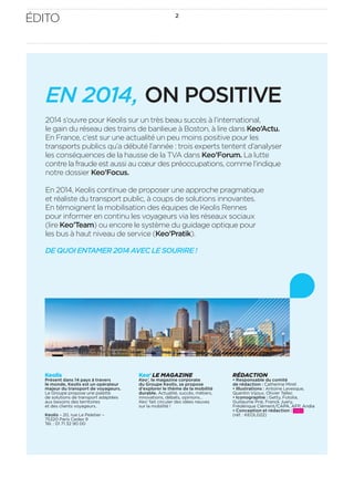 En février 2014, Keolis présente ses innovations et succès à l'international, notamment le gain d'un réseau de trains de banlieue à Boston et une analyse des conséquences de la hausse de la TVA sur les transports publics en France. Le dossier du magazine aborde également la lutte contre la fraude dans le transport public et explore des solutions pratiques comme l'information des voyageurs via les réseaux sociaux et le guidage optique pour les bus. La modernisation de l'action publique territoriale est au cœur des réformes récentes, offrant plus de pouvoir aux régions pour gérer leurs transports.