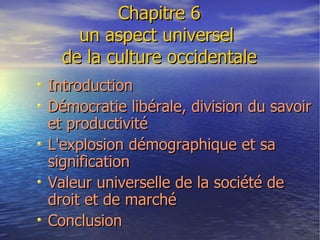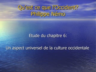 Le chapitre 6 de l'étude de Philippe Némo explore comment le modèle occidental, à travers cinq événements majeurs, s'est imposé mondialement, notamment par la démocratie libérale et l'impact économique. Il examine la relation entre explosion démographique, colonisation et adoption du système occidental, tout en soulignant la valeur universelle de la société de droit et de marché. La question centrale reste la nécessité d'une occidentalisation pour la modernisation des sociétés.