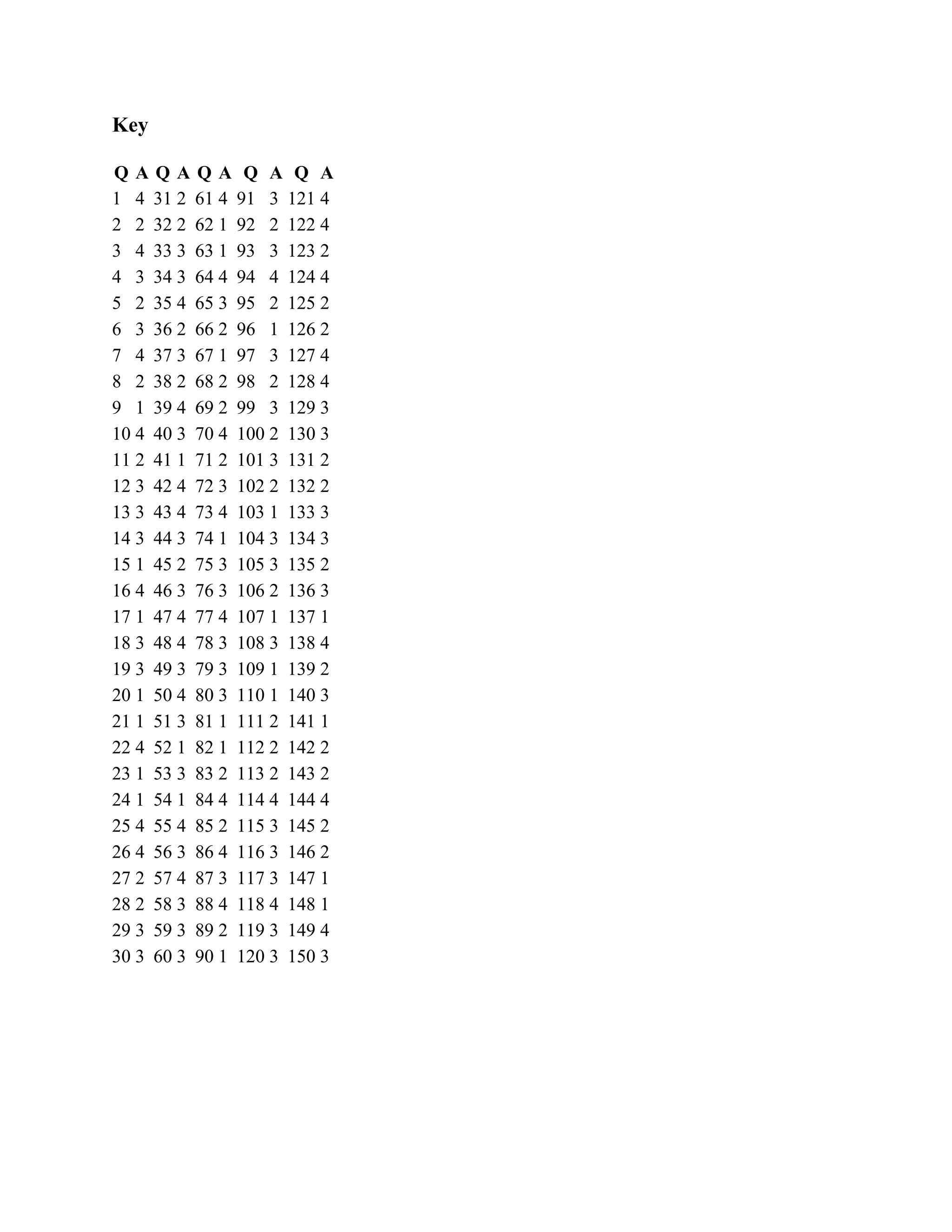 The document appears to contain a structured listing of numerical data, possibly related to a specific categorization or coding system. It features various keys associated with numbers, potentially indicating quantities or classifications. The lack of explicit context makes it difficult to ascertain the overall subject or purpose of the data presented.