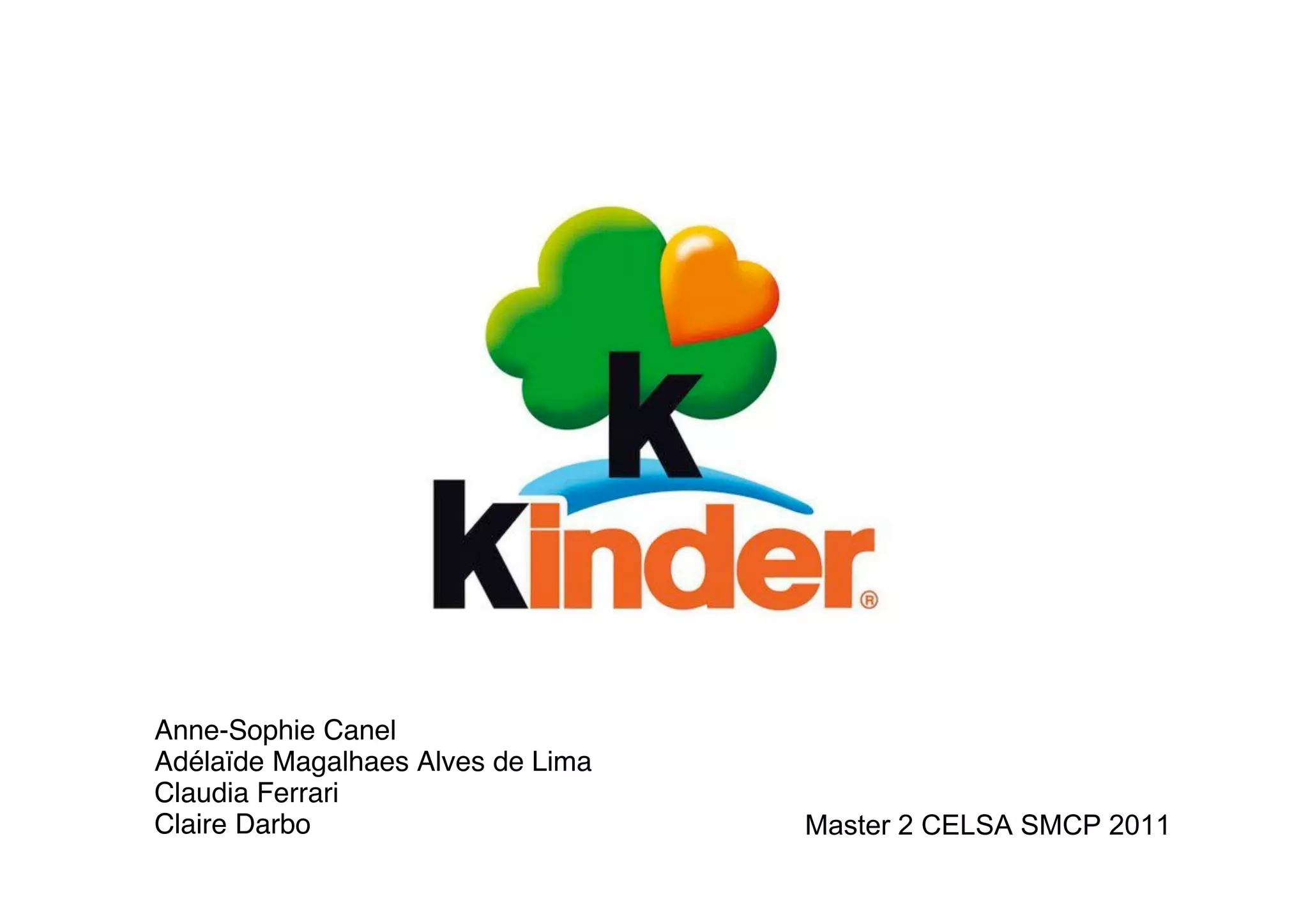 Le document présente l'analyse de la marque Ferrero, en particulier Kinder, en mettant en avant son positionnement sur le marché des encas en France, ciblant principalement les enfants et les adultes. Il examine les valeurs narratives et esthétiques de la marque, ainsi que ses stratégies publicitaires visant à concilier plaisir et nutrition. Des recommandations sont proposées pour le développement de produits et le positionnement envers les adultes pour transmettre des valeurs d'apprentissage.