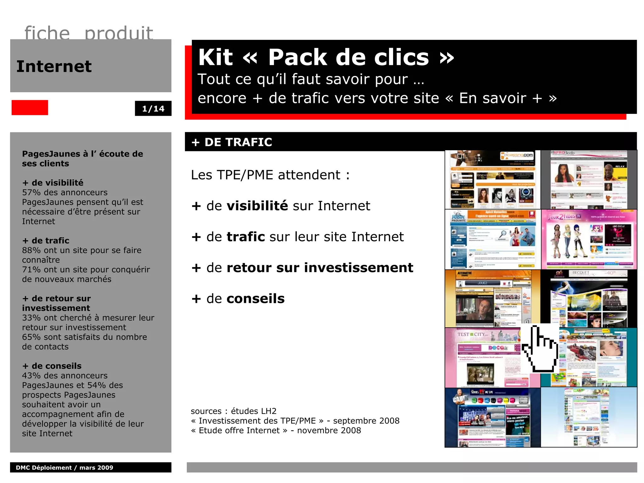 PagesJaunes propose un kit 'pack de clics' pour accroître la visibilité des TPE/PME sur Internet, avec des services d'affiliation soutenus par un réseau de 6500 sites partenaires. Ce kit permet de générer plus de trafic vers les sites des annonceurs et inclut des options de tarification au clic et à la performance. Le programme vise à fournir une solution clé en main pour les entreprises souhaitant améliorer leur retour sur investissement et optimiser leur présence en ligne.