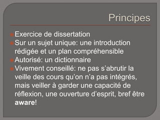 Le document fournit des conseils pour rédiger une dissertation sur un sujet unique, en insistant sur l'importance de comprendre et d'analyser les termes clés tels que 'communication', 'média' et 'cyberculture'. Il encourage également à prêter attention à la structure de l'énoncé et à explorer les différentes interprétations possibles des concepts abordés. Enfin, il met en avant la nécessité d'une réflexion critique pour éviter de ne présenter que des connaissances superficielles.