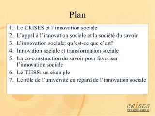 Le document explore le lien entre l'université et la communauté à travers la co-construction du savoir comme levier pour l'innovation sociale. Il met en lumière les défis et opportunités posés par la société du savoir, ainsi que le rôle central des universités dans ce processus. Des exemples, comme le TIESS, illustrent la collaboration entre acteurs académiques et sociaux pour initier des transformations sociales durables.