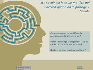 Le document explore la gestion des connaissances (KM) et les réseaux sociaux d'entreprise (RSE), en définissant leurs caractéristiques, avantages et limites. Il met en lumière leur émergence dans le contexte du web 2.0 et discute des bonnes pratiques, ainsi que des freins à leur adoption. Enfin, il examine des études de cas pratiques, soulignant l'importance de ces outils pour améliorer la communication, la collaboration et l'innovation au sein des entreprises.