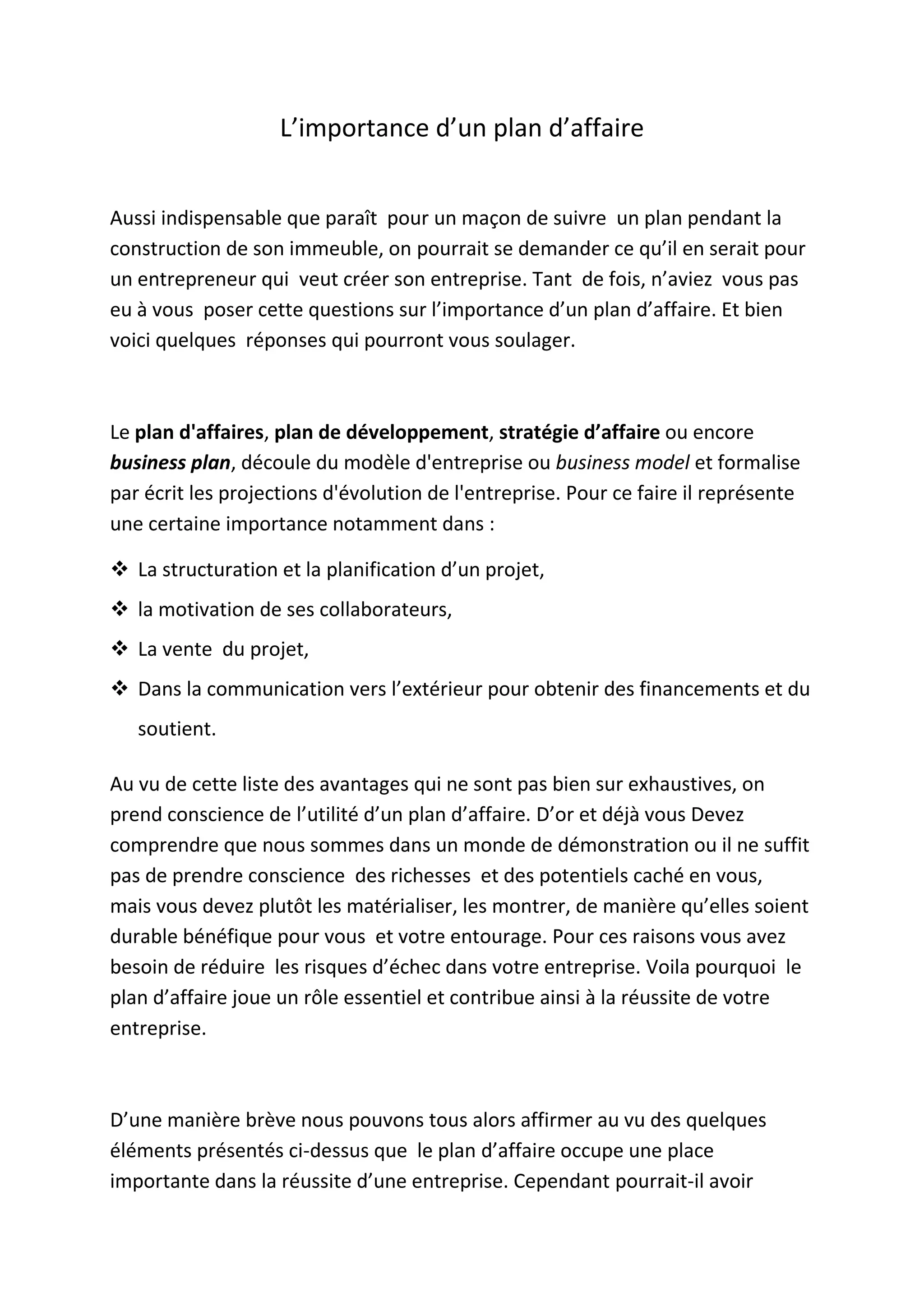 Un plan d'affaires est essentiel pour les entrepreneurs, tout comme un plan de construction pour un maçon. Il formalise les projections de l'entreprise et aide à la structuration, à la motivation des collaborateurs, à la vente du projet et à l'obtention de financements. En réduisant les risques d'échec, il contribue de manière significative à la réussite d'une entreprise.
