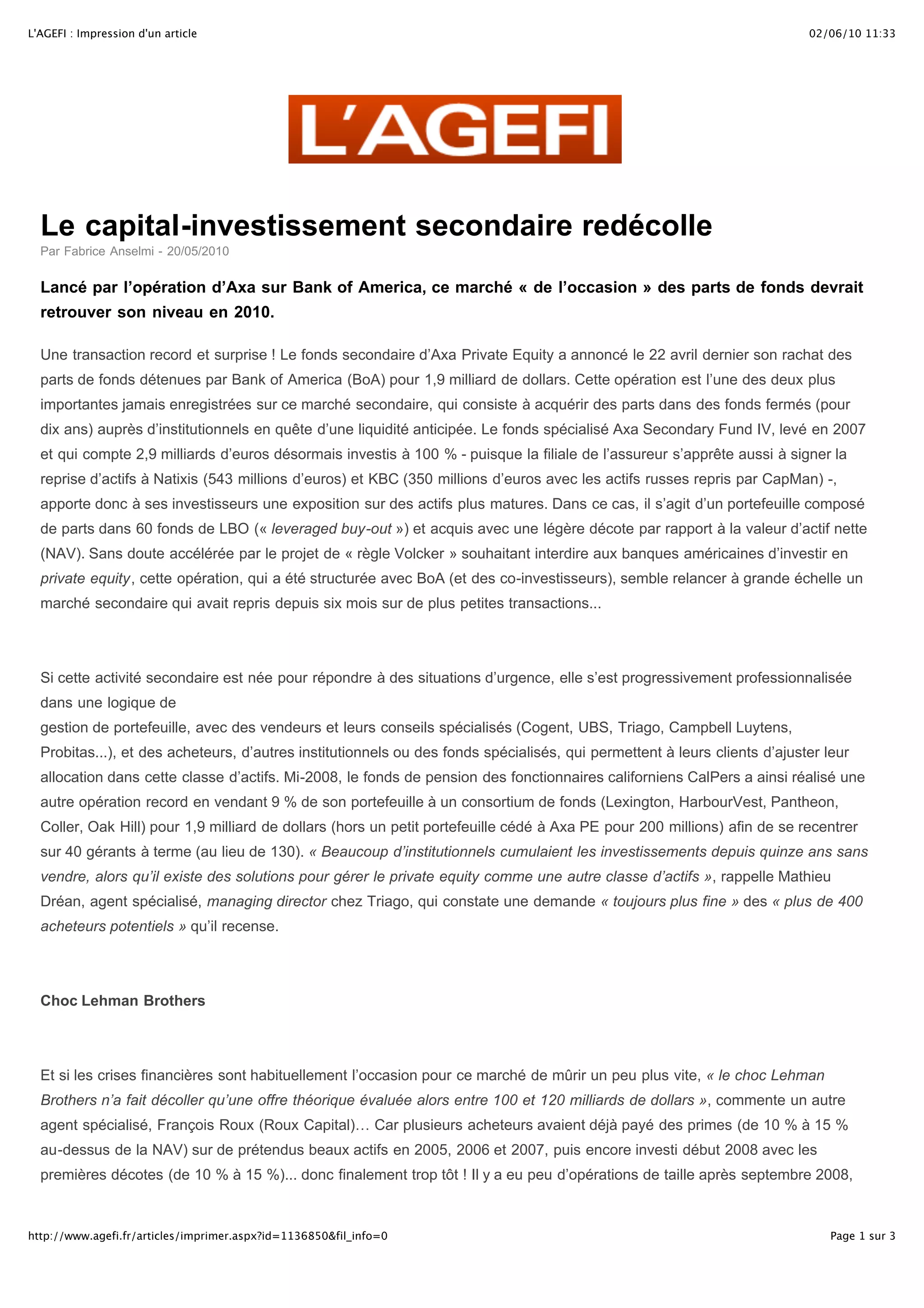 Le marché du capital-investissement secondaire connaît un regain avec la transaction record d'AXA rachetant les parts de Bank of America pour 1,9 milliard de dollars. Ce marché, spécialisé dans l'achat de parts de fonds fermés, s'est professionnalisé, et les banques cherchent à alléger leur bilan en vendant des actifs, notamment dans un contexte de reprise de valeur. Les tendances récentes indiquent une demande croissante et un retour de confiance parmi les acheteurs.