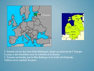 L'Estonie est un des trois États baltiques situé en Europe du Nord-Est, avec des frontières avec la Letttonie et la Russie. Sa capitale est Tallinn, qui est accompagnée d'autres villes comme Tartu, ainsi que des attractions telles que le parc national de Lahemaa et le manoir Palmse.