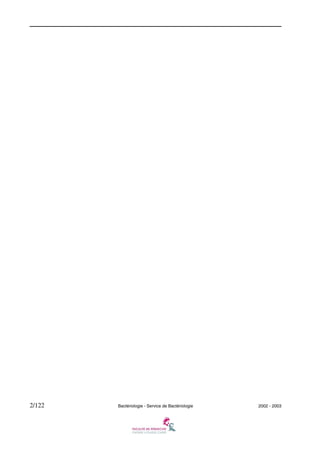 Ce document est un cours de bactériologie de l'Université Pierre et Marie Curie pour le niveau DCEM1, couvrant divers aspects des bactéries, y compris leur anatomie, génétique, et pathogénicité. Il détaille également l'étude des principales familles de bactéries, leur diagnostic et les traitements associés. La mise à jour date du 24 mars 2003 et le document comprend des chapitres et une table des matières exhaustive.