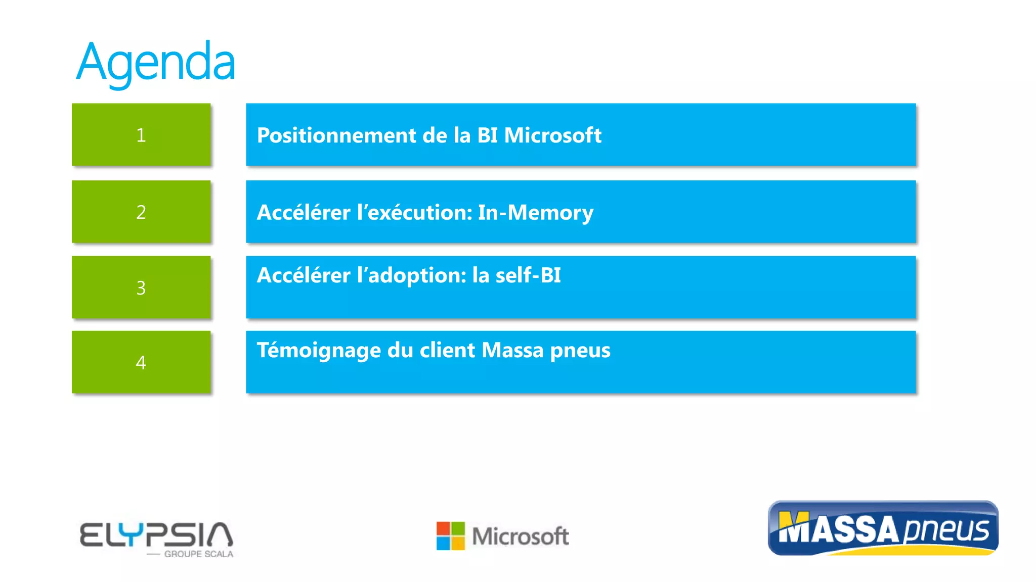Le document discute du positionnement de Microsoft en matière de business intelligence (BI) et des solutions SQL Server, notamment l'accélération de l'exécution via l'in-memory et l'adoption de la self-BI. Il présente des cas d'utilisation, tels que la transformation de Bwin grâce à la technologie in-memory, et souligne les avantages des index en colonnes pour optimiser les entrepôts de données. Enfin, il mentionne les outils de BI disponibles et leur intégration avec des plateformes comme Azure et Office 365.