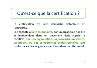 La certification est un processus volontaire permettant aux entreprises de prouver que leurs produits, services ou compétences répondent à des normes spécifiques, validée par un organisme indépendant. Elle offre des bénéfices tels qu'une amélioration de l'image de l'entreprise, une confiance accrue des clients, et un meilleur accès aux marchés. Les audits réguliers et le renouvellement tous les trois ans assurent la conformité continue des certificats.