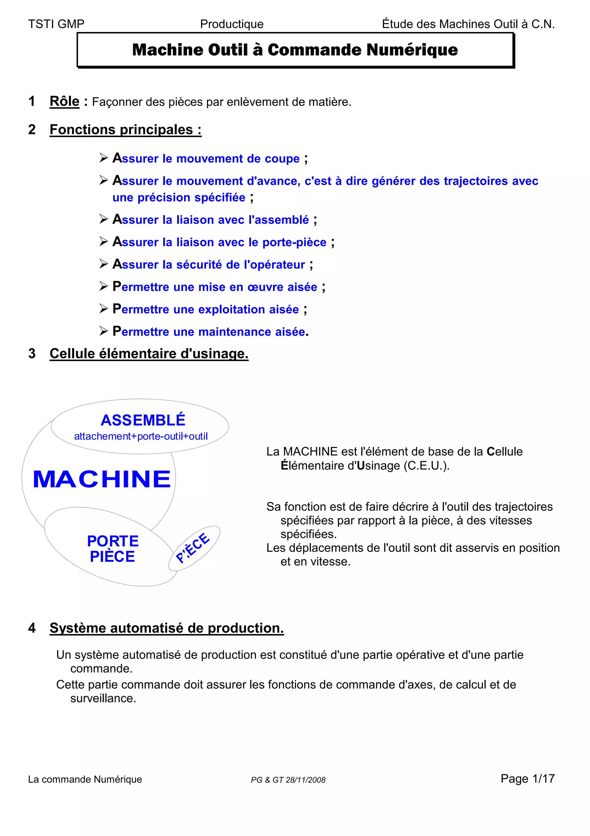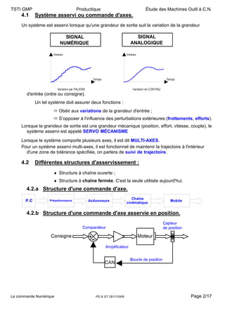 Le document traite des machines-outils à commande numérique, expliquant leur rôle, leur fonctionnement et les systèmes d'asservissement nécessaires pour assurer des mouvements de coupe précis. Il aborde également la modélisation géométrique des axes principaux et les démarches à suivre pour optimiser la mise en œuvre de ces machines dans le cadre de la production. Enfin, le texte souligne l'importance de la prise en compte des dimensions intrinsèques pour garantir la conformité dans le processus d'usinage.